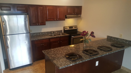 Larger one bedroom/one baths (600 sq. ft.), new kitchens, granite countertops, stainless steel appliances, large closets, tile throughout, off street parking and private patio.